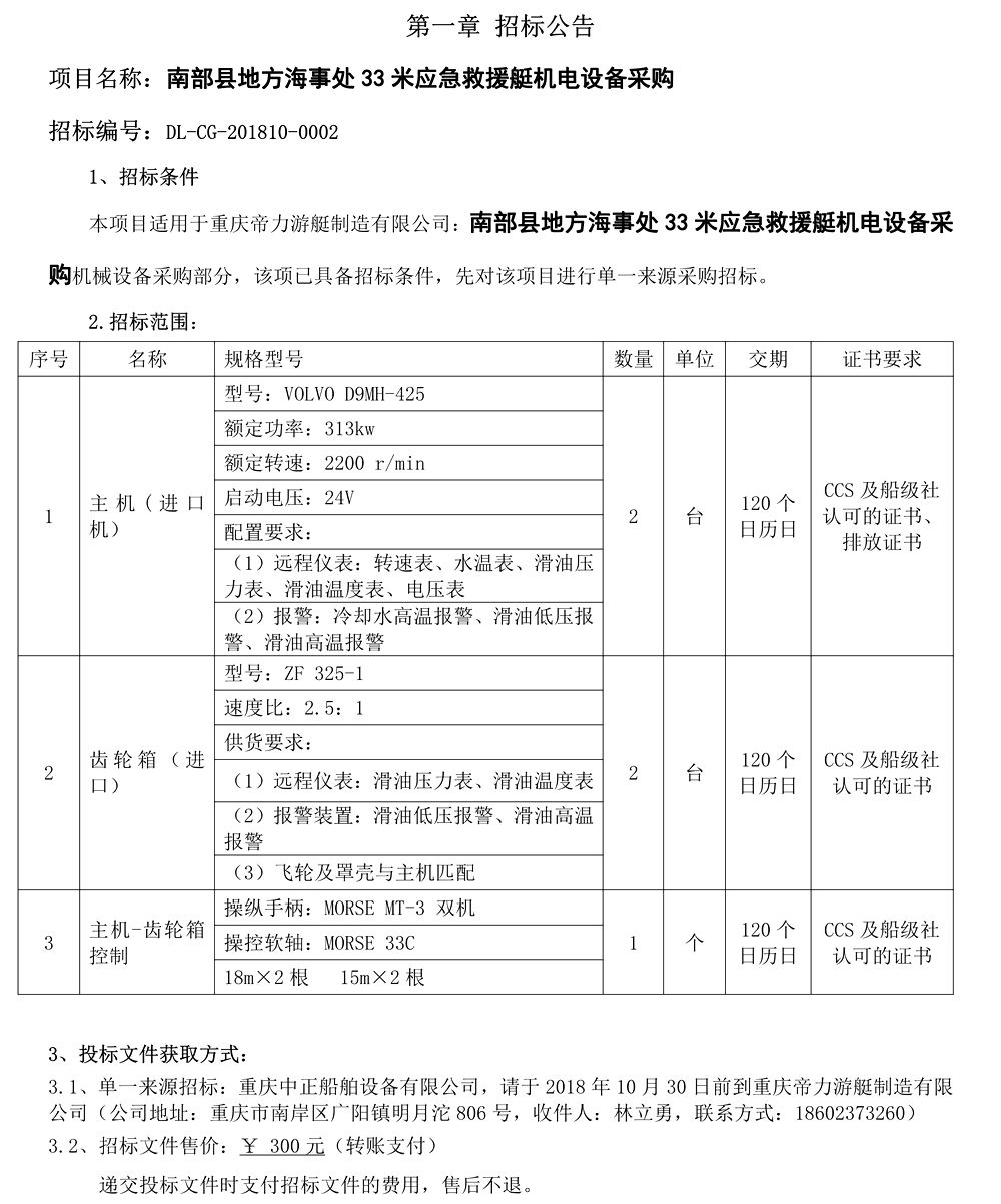 蓬安縣地方海事處33米應(yīng)急救援艇機電設(shè)備采購