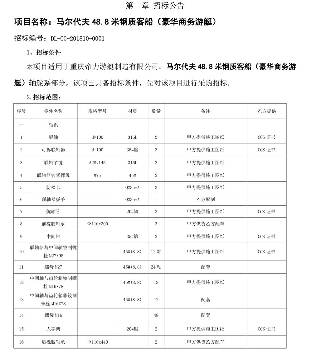 馬爾代夫48.8米鋼質(zhì)客船(豪華商務(wù)游艇)軸舵系部分招標(biāo)
