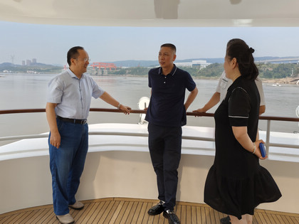 調(diào)研伊始,我司領(lǐng)導陪同溫良德董事長一行參觀了為四川省廣安航務(wù)海事事務(wù)中心打造的40米應(yīng)急救援船。領(lǐng)導們聽取了該救援船技術(shù)創(chuàng)新、性能優(yōu)勢等詳細介紹。